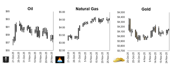 Oil prices are lower and at one-month lows on optimism that a Ukrainian peace deal is getting closer, a development that could ease restrictions on Russian oil in an already-oversupplied market. Much of Russia’s oil and fuel is subject to heavy Western sanctions, with U.S. restrictions on the two biggest producers kicking in last week. However, China, India and Turkey have been eager buyers of the discounted crude, so the impact on global prices from any lifting of curbs is hard to gauge. Crude benchmarks have are down near –20% since the middle of June as OPEC+ restored barrels, while producers outside of the group also pumped more. Worldwide crude supply is expected to exceed demand by a record 4 million bpd next year, the International Energy Agency forecast this month. On the inventory side, the American Petroleum Institute showed that nationwide crude inventories fell by a modest 1.9 million barrels last week.