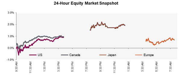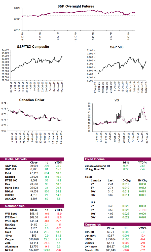 Markets appear chipper this morning heading into U.S. Thanksgiving, the unofficial start of the holiday season. North American futures are higher, extending gains that began last Friday. After AI bubble worries sparked last week’s downturn, markets seem to have reshuffled their AI bets, with Nvidia moving lower while Alphabet has climbed. Alphabet got a boost from reports that Meta is in talks to use Google-made chips to reduce its heavy reliance on Nvidia. Sentiment is also being supported by expectations that the Fed will cut interest rates again in December. A reminder that U.S. markets will be closed tomorrow for Thanksgiving, and Black Friday will be a shortened trading day. With an early close, institutional participation is usually lighter, and volumes are lower, making it one of the quieter sessions of the year. For many Americans, and some Canadians, the break also means time to hunt for deals and watch football.