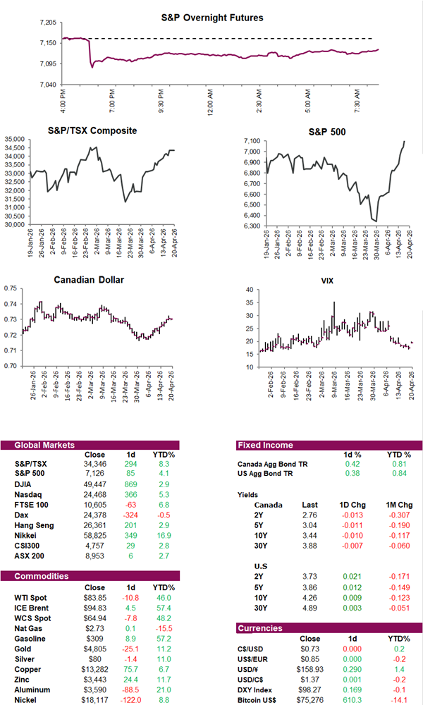 Stock futures pointing higher with U.S. equities extending the rally sparked by optimism around a potential U.S.–Iran deal, after Trump said talks between the two sides could resume this weekend and that he could make an appearance. Markets continued higher in yesterday’s session, with the S&P 500 and Nasdaq reaching new highs, supported by strength in tech, which is rebounding after earlier pressure tied to AI disruption concerns. The Nasdaq rose 0.4%, marking its 12th consecutive day of gains, the longest streak since 2009, and is on track to finish the week up about 5%, with the S&P 500 up roughly 3%. Canadian equity futures are also moving higher. While the TSX closed slightly lower yesterday, it remains on pace to finish the week up around 2%.