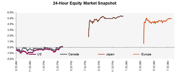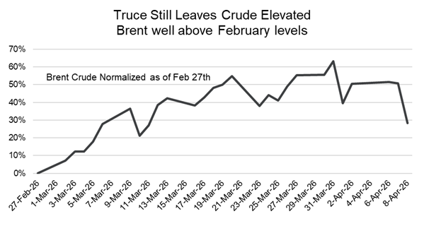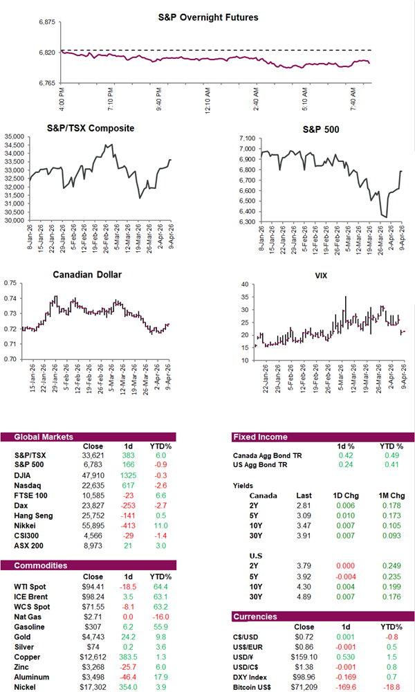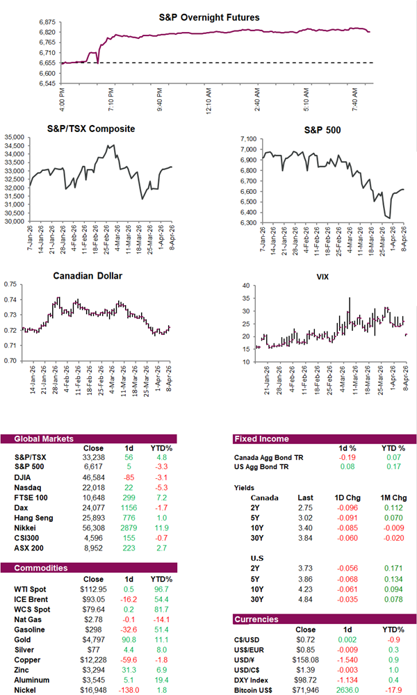 The pause in hostilities has triggered a sharp risk-on move, with U.S. and Canadian equity futures markedly higher, oil prices plunging, and global government bonds rallying as yields fell on expectations that central banks may not need to tighten policy further to offset war-driven inflation. The announcement came at the eleventh hour via social media, with Trump saying he had agreed to a two-week ceasefire, reportedly mediated by Pakistan Prime Minister Shehbaz Sharif, contingent on the immediate reopening of the Strait of Hormuz for safe passage. The relief rally has been global, with Europe’s DAX and CAC 40 up nearly 5% at the time of writing, while in Asia, Korea and Japan led gains, rising approximately 7% and 5%, respectively. Investors who had been pricing in a prolonged conflict and its potential drag on global growth are, for now, reassessing that risk, interpreting the latest developments as a possible step toward de-escalation, though the durability of that shift, as we have learned, remains uncertain.