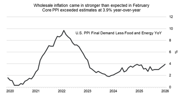 Coming in hot. Investors are assessing the latest U.S. wholesale inflation data which came in stronger than expected in February. The producer price index rose 0.7% month-over-month and 3.4% annually, both above forecasts, while core PPI also exceeded estimates at 0.5% on the month and 3.9% year-over-year. The data signals growing cost pressures across goods and services, even as earlier consumer inflation readings had shown some moderation. The figures also largely predate the recent Iran-related oil shock, suggesting inflation risks could further intensify as higher energy prices feed through the economy and begin to weigh on consumer sentiment.