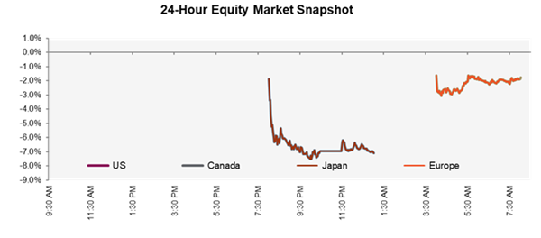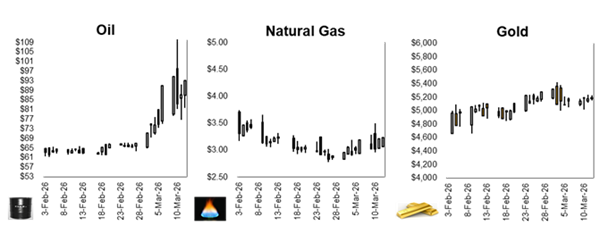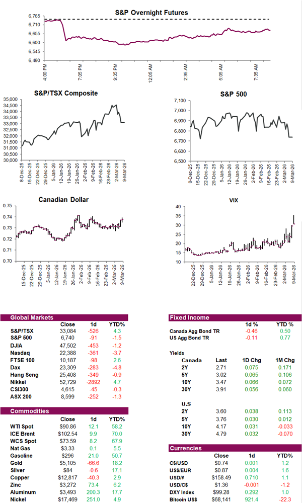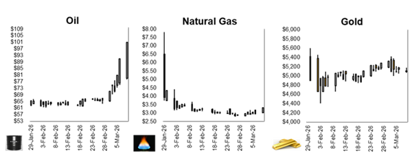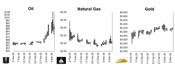 Equity futures are looking to open lower to start the week, as oil prices rose above $100 a barrel, raising inflation fears. Oil prices spiked after Middle East producers cut output amid the continued closure of the Strait of Hormuz, with WTI jumping to around $103 and Brent nearing $105. The rise in energy prices has increased concerns that prolonged conflict could pressure growth while keeping inflation elevated, complicating the Fed’s policy outlook. Stocks most sensitive to economic growth, including financials and industrials, have led declines, while energy and defense shares rose. Volatility has extended across the globe with European markets hit particularly hard. Blue-chip European stocks are now nearing a -10% drop from February highs with traders now pricing in potential interest-rate hikes from the ECB and the BOE. Although news that G7 finance ministers may discuss releasing oil from strategic reserves briefly tempered the selloff, investors remain focused on the risk that a prolonged conflict could drive stagflation pressures and keep central banks from easing policy.