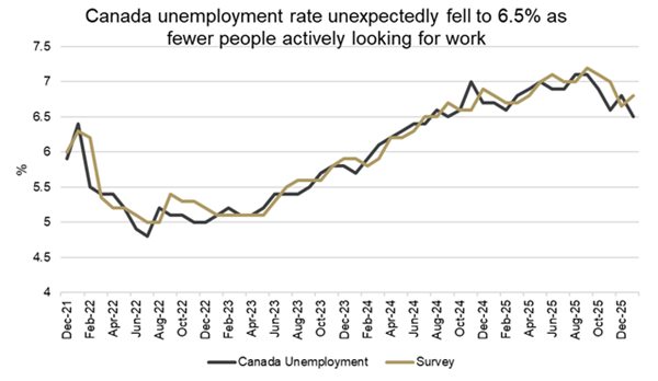 Canada’s labour market weakened in January as the economy lost 24,800 jobs, the steepest drop since August, driven largely by manufacturing layoffs linked to U.S. tariffs. Still, the unemployment rate fell to 6.5% because fewer people were actively looking for work. Data from Stats Canada showed Ontario saw the most job losses, shedding 67,000 positions, with the auto sector hit hard and GM cutting about 500 jobs at its Oshawa plant. Manufacturing employment fell by 51,000 over the past year, and more workers in export-dependent industries are considering quitting as trade tensions continue under Trump’s tariffs. The participation rate dropped to 65% as more Canadians exited the workforce, reflecting both demographic aging and immigration curbs, which helped mask underlying weakness. Meanwhile, wage growth cooled to 3.3%, suggesting softer labour demand and adding to signs that momentum in Canada’s job market is fading.