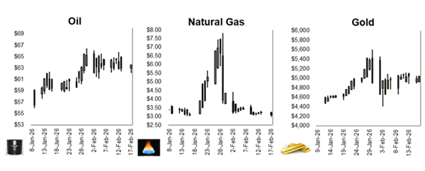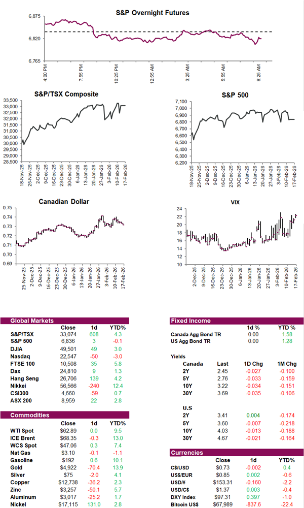 Futures are moving lower as North American markets return from a holiday break, with many Asian markets closed for Lunar New Year. Treasuries edged higher, pushing the 10-year yield down to 4.03%, supported by last week’s softer inflation data and a broader risk-off tone. Gold retreated toward $4,900 an ounce, while silver fell sharply, and Bitcoin also declined. Investors are also monitoring rising Middle East tensions, upcoming ADP payroll data, comments from Fed officials, and minutes from the Fed’s January meeting, all of which could shape expectations for the interest-rate path. This comes as the S&P 500 comes off its second consecutive losing week as fears about AI’s disruption hit industries such as software, real estate, trucking, and financial services. Both the S&P 500 and Dow lost more than -1% last week while the Nasdaq lost more than -2%. The TSX, however, rose 1.86%, bringing its YTD performance to 4.3%, an impressive feat when compared to the S&P 500 which is flat for the year.