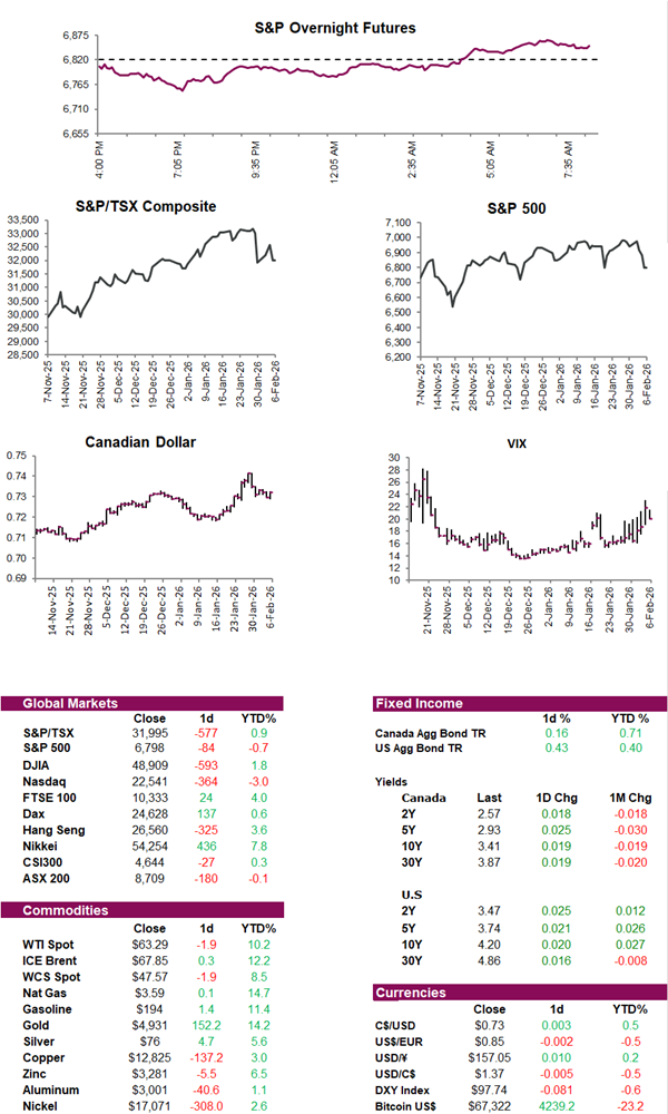 Equity futures are pointing higher following another volatile session, which saw investors pull back from risk across equities, commodities, and crypto, with stretched valuations and growing macro worries triggering the selling. Equities slid yesterday after software and AI-linked stocks dropped on new competitive threats from Anthropic, while silver plunged about -20% and Bitcoin tumbled more than -13% as leveraged positions were unwound. Safe havens like Treasuries rallied, and big-cap tech came under pressure after heavy spending plans reignited concerns that companies may be overspending on AI. At the same time, weaker labour data out of the U.S. and uncertainty about future policy at the Fed have added to anxiety. All this to say, it’s been quite the week. A good time to kick back and enjoy the Olympics.