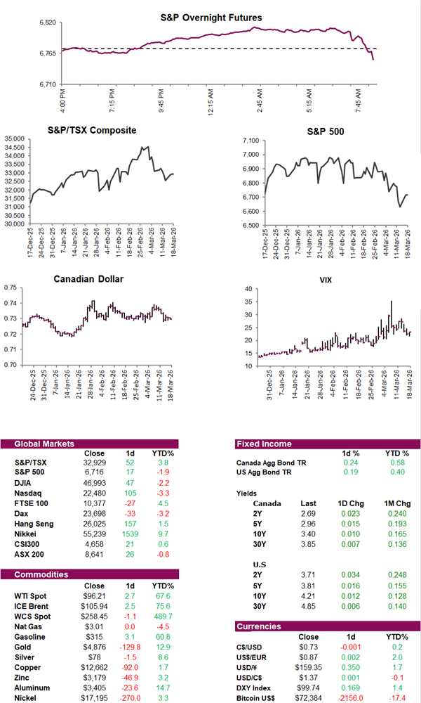 Futures which were higher earlier this morning have now turned negative after Iran said the U.S. and Israel struck its giant South Pars gas field in the Persian Gulf and U.S. PPI data came in hotter than expected, fueling inflation concerns. Markets are also focused on how the BoC and Federal Reserve will interpret the inflation and growth risks stemming from the Middle East war, with policymakers expected to hold rates steady while emphasizing uncertainty and data dependence. Meanwhile, strength in tech and AI-related stocks provided additional support to markets, though ongoing geopolitical tensions and the risk of renewed energy shocks continue to leave investors cautious about the strength of the rebound.