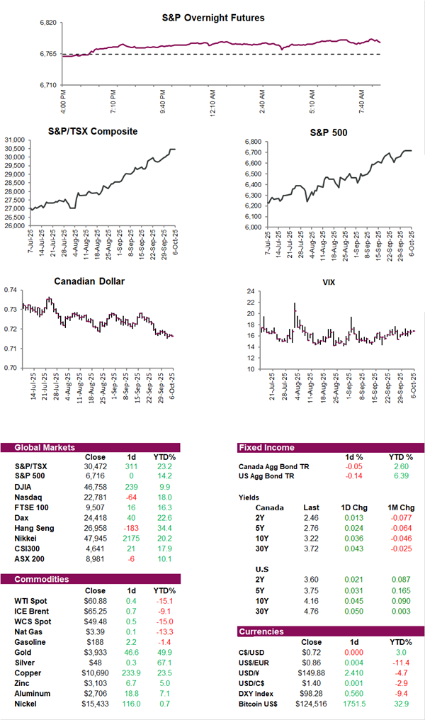Equities are rising to start the week, as optimism over a major regional bank merger in the U.S. and AMD’s new AI partnership with OpenAI fueled hopes for broader M&A momentum, even as the government shutdown entered its second week. Alongside the U.S. government shutdown, Japan is set for a policy reset after Sanae Takaichi won the ruling party leadership, positioning her to become the country’s first woman prime minister. Japan’s Nikkei and Topix stock indexes jumped to all-time highs while the yen weakened on the headlines. In France, Prime Minister Sebastien Lecournu resigned after less than a month, the fourth PM to depart in just over a year, highlighting President Macron’s difficulty in forming a stable government. The CAC 40 slipped and French bond yields rose.