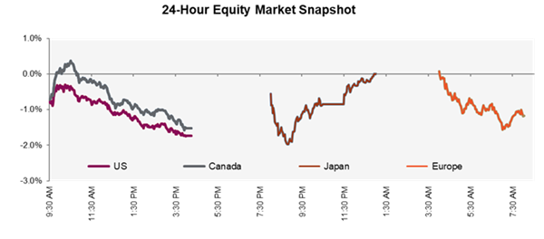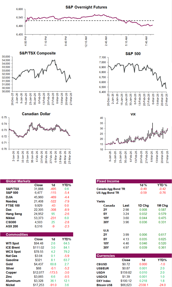 Iran and Israel continue to exchange strikes despite Trump’s latest 10-day extension on attacks targeting Iranian energy infrastructure, highlighting the limited impact of the pause on the trajectory of the conflict thus far. Against that backdrop, Canadian and U.S. equities are poised to open lower again this morning, with risk sentiment remaining cautious. Yesterday’s selloff pushed the Nasdaq into correction territory from its late-October peak, while the S&P 500 closed at its lowest level since September 2025. In Canada, the TSX fell -1.53%, erasing earlier gains and leaving the index flat year-to-date, as higher oil prices, rising yields, and ongoing geopolitical uncertainty continue to weigh on markets.