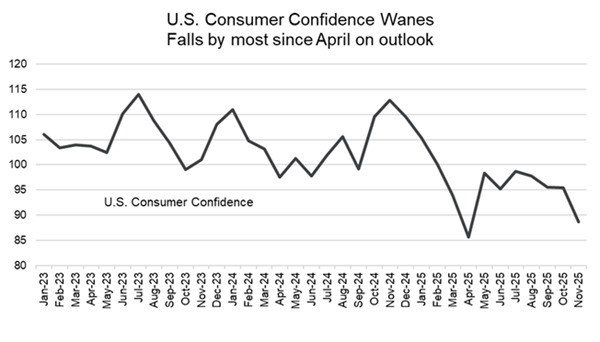 Less things to be thankful for this U.S. Thanksgiving (according to consumers). Consumer confidence in the U.S. fell in November, dropping to 88.7, the weakest reading since April. This comes as Americans grow more worried about the labour market, income prospects, and overall economic conditions. Measures of both expectations and present conditions declined, with more consumers saying that jobs are harder to get. Income expectations also fell, reaching their lowest level since early 2023, and buying plans for major purchases are being put on hold. The decline shows just how much anxiety there is over inflation, the cooling labour market, and the overall uncertainty, bringing sentiment to levels well below those seen before the pandemic.
