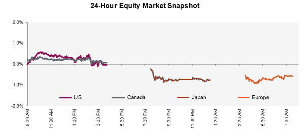 U.S. equity futures are lower this morning as investors digest a slate of key economic reports that were delayed by the U.S. government shutdown. The Nasdaq has fallen for three straight sessions as AI-related unease mounts. In Canada, the TSX is looking to open lower, pressured by energy shares after Trump said Russia and Ukraine were closer to a peace deal, pushing oil prices down. While European leaders have vowed to protect Ukraine against Russian aggression and the U.S. has offered security guarantees, disagreements over Ukrainian territory remain. In Europe, defence stocks declined alongside oil, with Brent trading near a four-year low after falling below $60 a barrel (see commodities below for details).