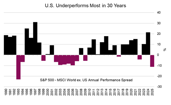 A tale of two safe havens. This year saw some classic safety trades fail to protect, while others literally shined. Precious metals and defense stocks were the clear winners this year amid a turbulent global backdrop, with gold rising more than 60% (its strongest gain since the late 1970s) while silver and platinum more than doubled, supported by central-bank demand and their role in the tech build-out. On the other hand, other traditional safe havens disappointed as government bonds delivered weak or negative real returns, defensive equity sectors lagged growth, and oil prices fell. Haven currencies also diverged, with the Swiss franc holding gains while the yen and U.S. dollar weakened, and volatility strategies failed to pay off. Overall, caution was penalized this year, with investors rewarded for exposure to metals and growth assets rather than the typical safety plays.
