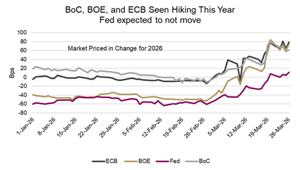 Flip flopping. Markets have rapidly swung to pricing aggressive rate hikes in response to the Middle East energy shock, but this reaction may be overdone. Traders have quickly repriced expectations as oil and gas prices rise, flipping from rate cuts to multiple hikes across major economies, including a dramatic 125 bps swing in UK rate expectations and new tightening bets for the ECB . However, unlike last time central banks raised rate in 2022, interest rates are already much higher, fiscal stimulus is smaller, and early data show growth is weakening. With this in mind, some economists still expect rate cuts, arguing the inflation spike will be temporary while the hit to growth and employment will be more persistent, making it difficult for central banks to justify tightening if economic conditions deteriorate.