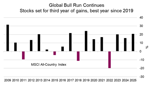 Wrapping up the year with a bow. Global equities delivered impressive returns in 2025, with some markets posting double-digit gains and regions like Europe, Japan, EM, and the UK benefiting from improving growth, fiscal support, and more attractive valuations. The results showed that investors did not need to solely rely on the U.S. (and just tech) for growth. Sector-wise, opportunities moved beyond tech, with financials seeing solid gains, healthcare trading at a rare discount despite resilient earnings, and AI-related infrastructure, utilities, and clean energy providing indirect exposure to AI without the hefty price tags and volatility. While the AI boom may continue, strategists note that investors who are concerned of elevated valuations may still have room to participate while also diversifying by region and sectors.