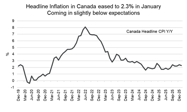 Headline inflation in Canada eased to 2.3% in January from 2.4% in December, coming in slightly below expectations as gasoline base effects helped cool annual price growth. Prices were flat month over month, versus forecasts for a modest increase, while the BoC’s preferred core measures also eased, with the median rate slipping to 2.5% and trim to 2.4%. Shelter inflation slowed to 1.7% year over year, its first reading below 2% in nearly five years, reflecting softer rent increases and lower mortgage interest costs. Consumers also saw relief in cellular services, which fell 0.8% on the month, and grocery inflation, which eased to 4.8% annually. The data is unlikely to shift the BoC from its current policy pause at 2.25%, as Governor Tiff Macklem has cautioned against cutting rates amid supply-side risks tied to U.S. tariffs.