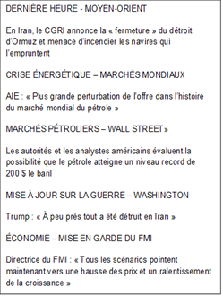 Revenons brièvement sur les six dernières semaines. Les hostilités ont éclaté à la fin de février, et les marchés ont ouvert en hausse le lundi. Mais à mesure que le conflit se poursuivait, les nouvelles ont commencé à peser sur les marchés. Le conflit a pris de l’ampleur et s’est prolongé, et le pétrole transitant par le détroit d’Ormuz s’est retrouvé bloqué. Pendant que les manchettes nous mettaient en garde contre l’inflation mondiale, une récession, une pénurie d’essence, l’urgence énergétique, etc., la guerre de mots était tout aussi dramatique : « le conflit est presque terminé », « nous allons tout détruire », « cessez-le-feu de deux semaines », « [je vous laisse le soin de prédire le prochain rebondissement] ».