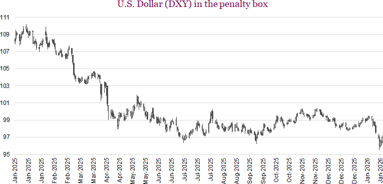 While the U.S. also experienced volatility, equities benefited from steady economic conditions and supportive corporate fundamentals. So far, Q4 earnings have been positive, with roughly three-quarters of companies beating profit expectations and blended earnings growth tracking near double digits, led by large tech companies. The Fed maintained its policy rate at 3.50%–3.75%, signaling a data-dependent, “wait-and-see” approach as inflation continues remain a concern. While discussions around future Fed leadership and policy direction added uncertainty, markets mostly focused on resilient growth and corporate profitability. Still, markets appear skeptical of the U.S., which we can see by the decline in the dollar. The dollar’s weakness comes amid rising fiscal deficits and increased policy uncertainty. The dollar did, however, get a boost towards the end of the month following the nomination of Kevin Warsh as the next Fed chair, a choice viewed as hawkish on inflation and supportive of tighter monetary policy. Expectations that rates could remain higher for longer briefly lifted Treasury yields and provided near-term support for the dollar, underscoring how sensitive currency markets remain to shifts in policy expectations.