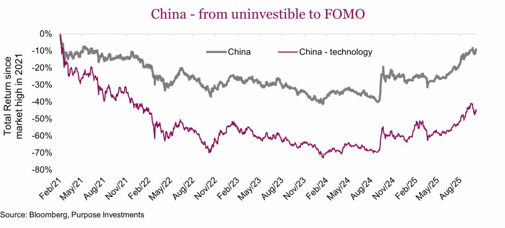 A few years ago, headlines abounded calling China ‘uninvestable’. It wasn’t just headlines — many famous market prognosticators and portfolio managers echoed the sentiment. The popularity of strategies ‘ex China’ increased in demand. There were many sound factors that contributed to this consensus view. Deflationary pressures due to overcapacity, regulatory crackdowns and a collapse in the property sector topped the list. Along with fear over an increasingly polarized world.
